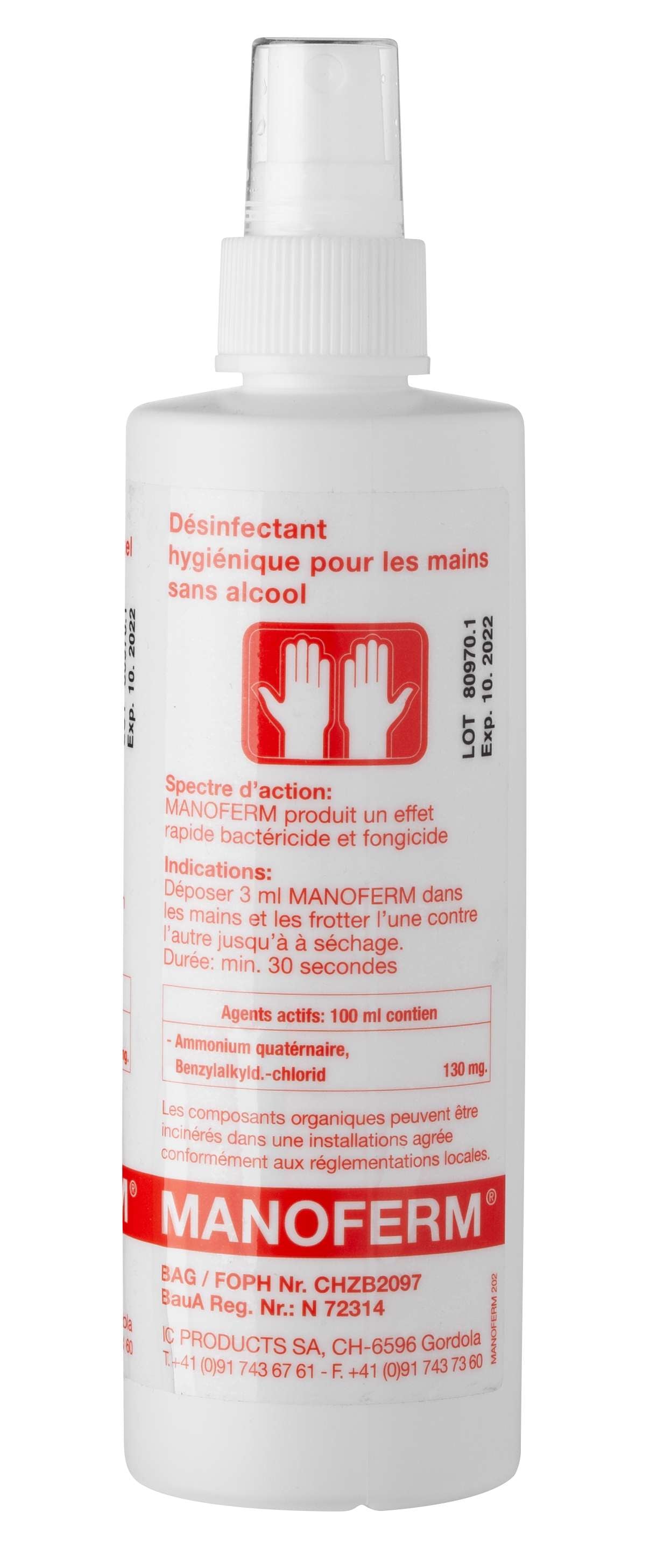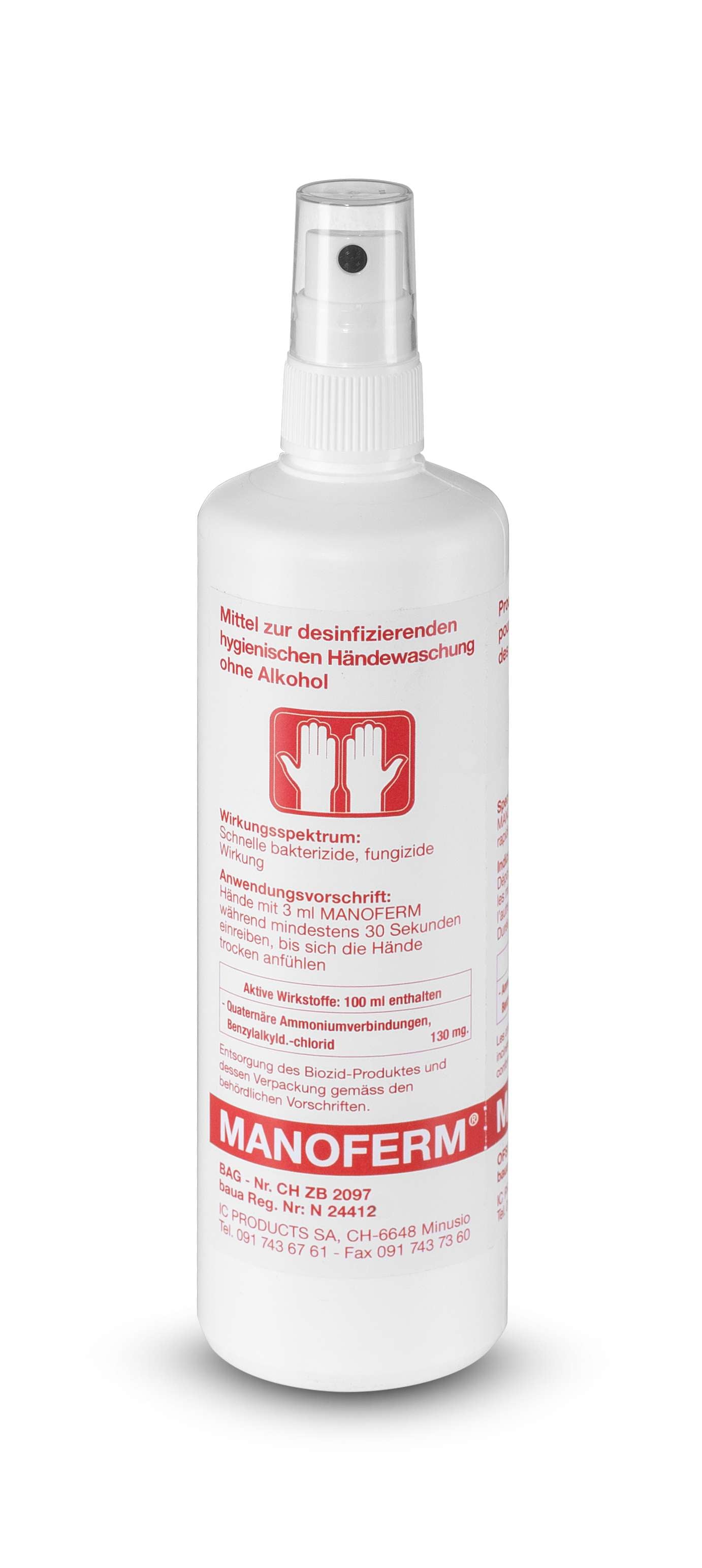Manoferm is a disinfectant for hands and skin hygiene. It is a ready-to-use application solution that contains no alcohol or other toxic substances. It neutralizes odour bacteria, does not dry out the skin, gentle disinfecting hygienic skin and hand washing for frequent use on sensitive skin. It does not stain, dissolves blood and is odorless.